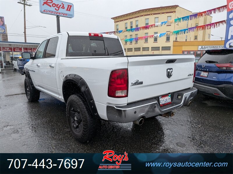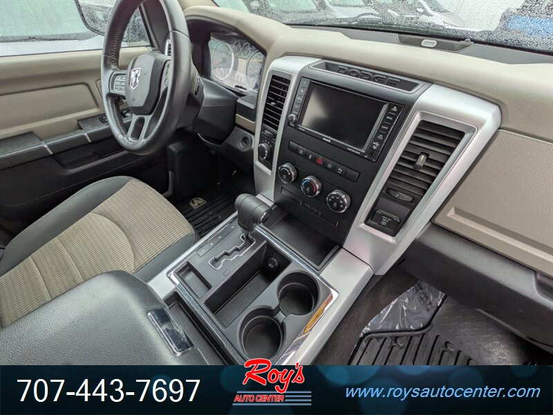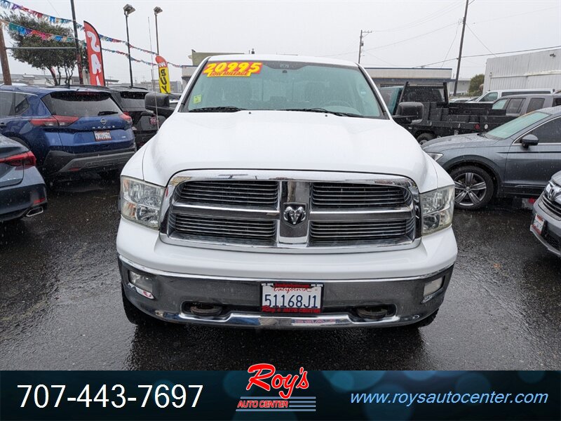 2012 RAM 1500 Big Horn 4WD with the HEMI 5.7L V8 (390 hp, 407 ft-lbs) and 6-speed automatic transmission. Finished in Bright White Clear Coat with Dark Slate/Medium Graystone cloth interior. Factory features include four-wheel drive, full-size cab with folding rear seat, power windows and locks, remote keyless entry, cruise control, air conditioning, tilt steering, center console storage and an AM/FM/CD audio system with auxiliary input. Safety systems include ABS, traction and stability control, front and side airbags, and tire pressure monitoring. Below 85,000 miles (averaging under 6,000 miles/year), excellent overall condition, and a clean CARFAX report.
