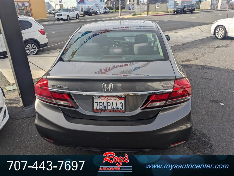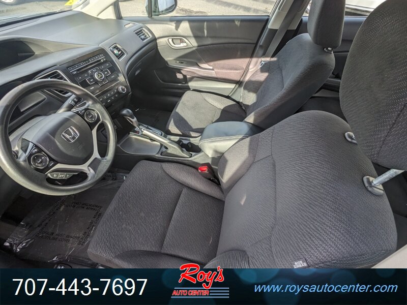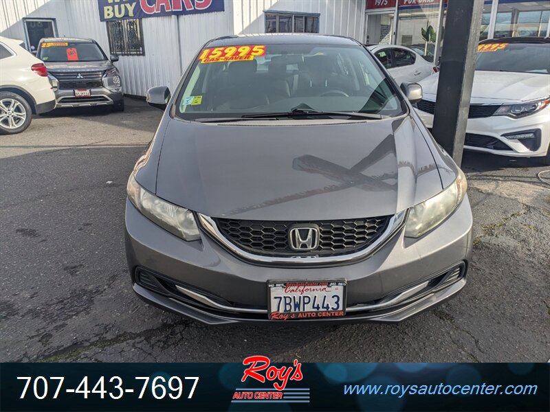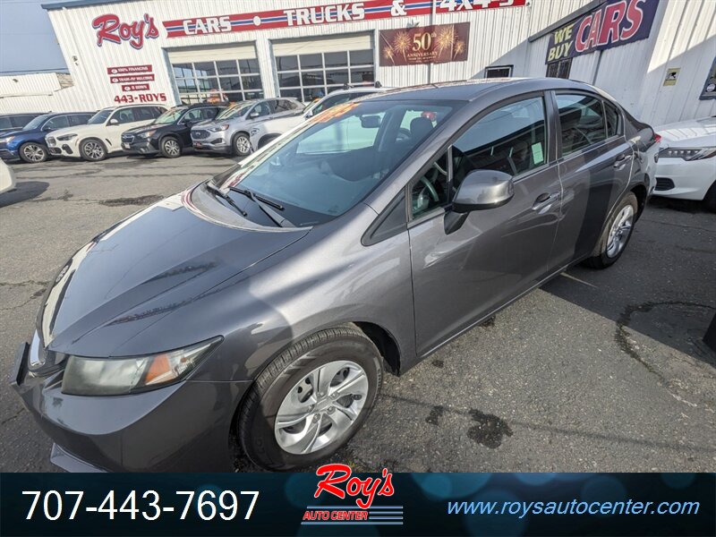 2013 Honda Civic LX in Polished Metal Metallic with Gray cloth interior, powered by the 1.8L I4 (140 hp, 128 lb-ft), under 81,000 miles (averaging less than 6,000 miles per year) and EPA-rated at 28 MPG city / 39 MPG highway. Factory-equipped comfort and convenience features include air conditioning, power windows and door locks, remote keyless entry, tilt steering, cruise control, cloth seating with a 60/40 split-folding rear seat, and an AM/FM/CD audio system with USB and auxiliary inputs plus Bluetooth hands-free capability. Standard factory safety and chassis equipment includes anti-lock brakes (ABS), Vehicle Stability Assist with traction control, front and side airbags with side-curtain airbags, tire pressure monitoring, and LATCH child-seat anchors. The vehicle is in excellent overall condition.