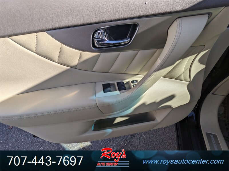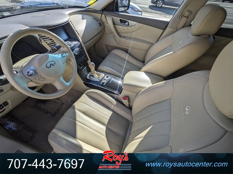 2013 INFINITI FX37 AWD in Black Obsidian with Wheat leather interior, powered by a 3.7L V6 producing 325 hp and 267 lb-ft of torque. Factory equipment includes AWD with a 7-speed automatic transmission and manual shift mode, leather-appointed heated front seats with power adjustments and driver memory, dual-zone automatic climate control, power moonroof, keyless entry and push-button start (Intelligent Key), Bluetooth hands-free audio streaming, AM/FM/CD with AUX/USB inputs and steering-wheel audio/cruise controls, rearview camera and power liftgate. Standard safety and convenience features include ABS, traction and stability control, full front and side-impact airbags with curtain protection, and tire pressure monitoring. Vehicle is in excellent overall condition, under 91,000 miles (averaging <7,000 miles/year) and shows a clean CARFAX.