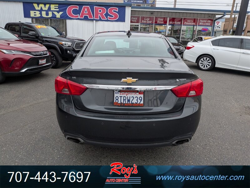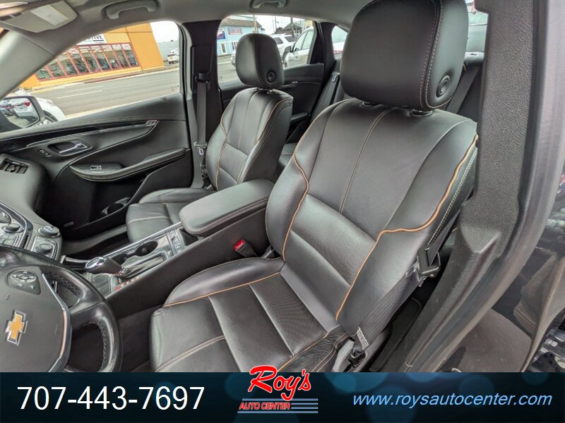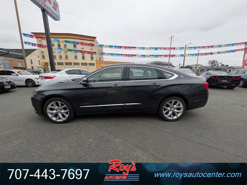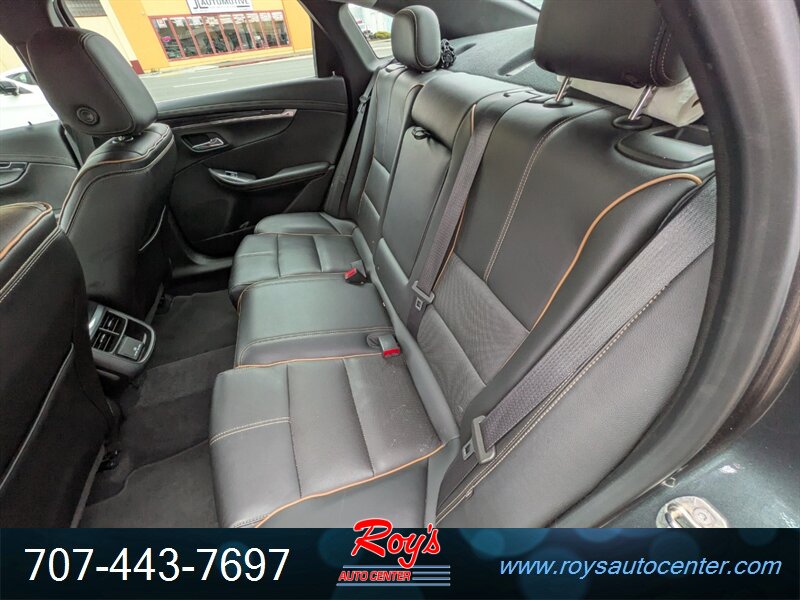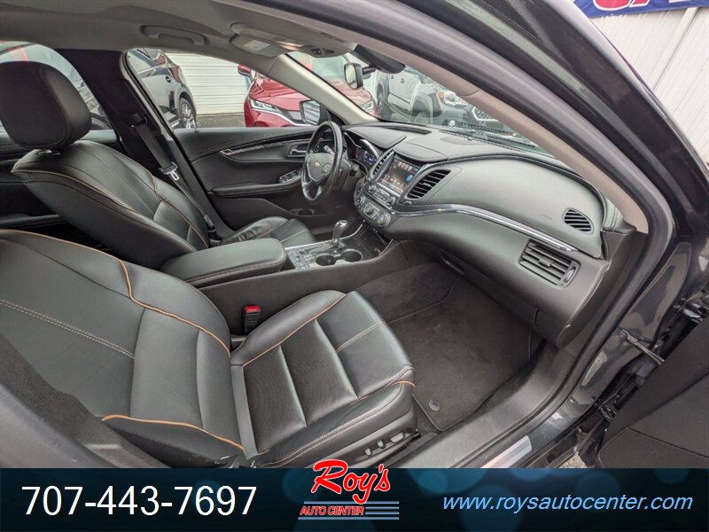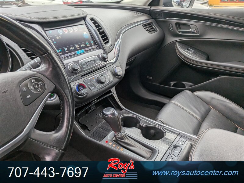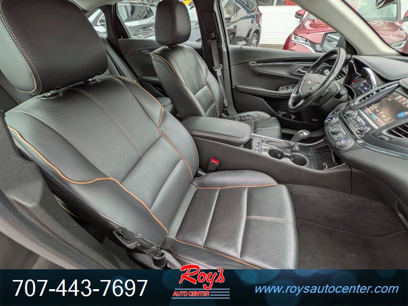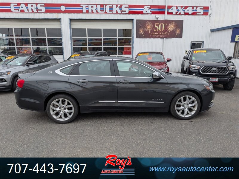 2018 Chevrolet Impala Premier in Nightfall Gray Metallic with Jet Black leather interior. Factory-equipped with a 3.6L FlexFuel V6 making 305 hp and 264 lb-ft of torque. Premier-level features include leather-appointed heated and ventilated front seats with power adjustments and driver memory, dual-zone automatic climate control, remote start, keyless entry with push-button start, Bose premium audio, an 8" Chevrolet infotainment touchscreen with Apple CarPlay/Android Auto and Bluetooth, rearview camera with rear park assist, blind-spot monitoring with rear cross-traffic alert, chrome exterior accents, 19" machined alloy wheels and HID projector headlights with LED daytime running lamps. Standard safety systems include StabiliTrak electronic stability control, ABS, traction control, multiple airbags and tire pressure monitoring. Vehicle is in excellent overall condition and has a clean CARFAX.