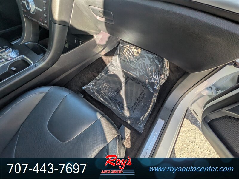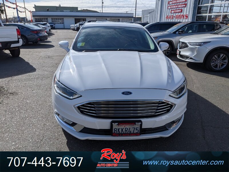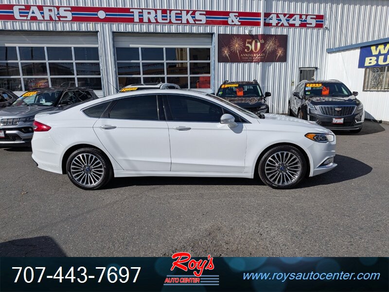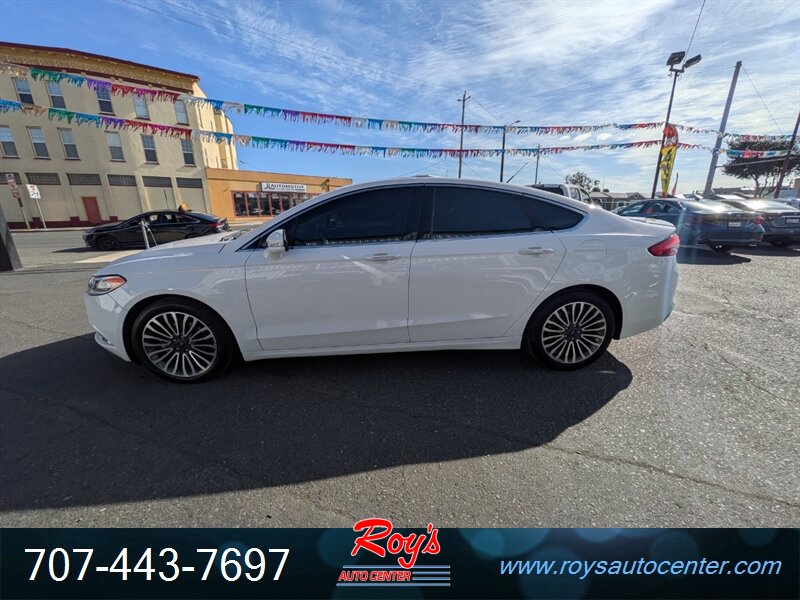 2018 Ford Fusion Titanium AWD in Oxford White with Ebony leather. Powered by a 2.0L EcoBoost turbocharged I4 producing 245 hp and 275 lb-ft; EPA-rated 20 MPG city / 29 MPG highway. Factory-equipped Titanium features include leather-trimmed heated front seats with power adjustments and memory, dual-zone automatic climate control, keyless entry with push-button start, SYNC 3 infotainment with touchscreen, Bluetooth and smartphone integration, alloy wheels and LED daytime running lights, blind-spot monitoring with cross-traffic alert, rearview camera, ABS, stability/traction control and a full complement of airbags. Vehicle is in excellent overall condition.