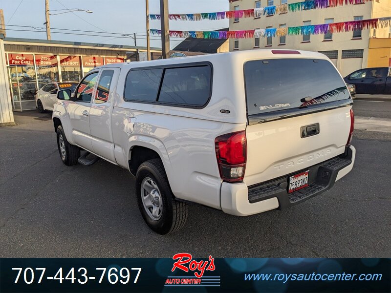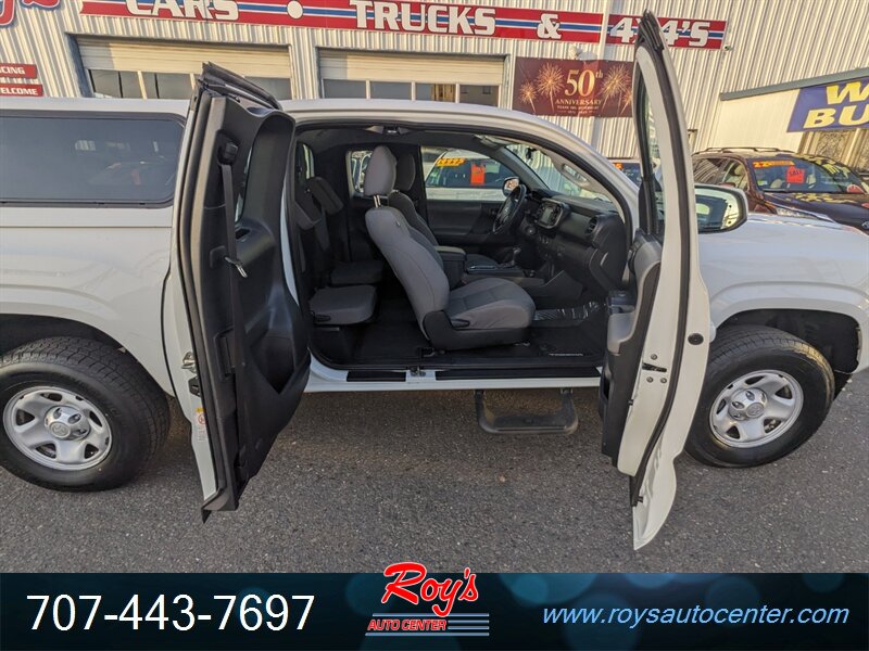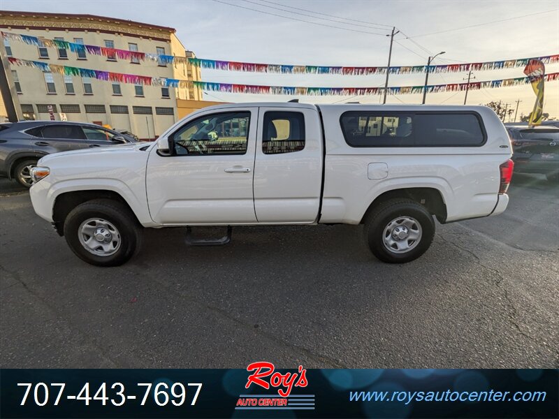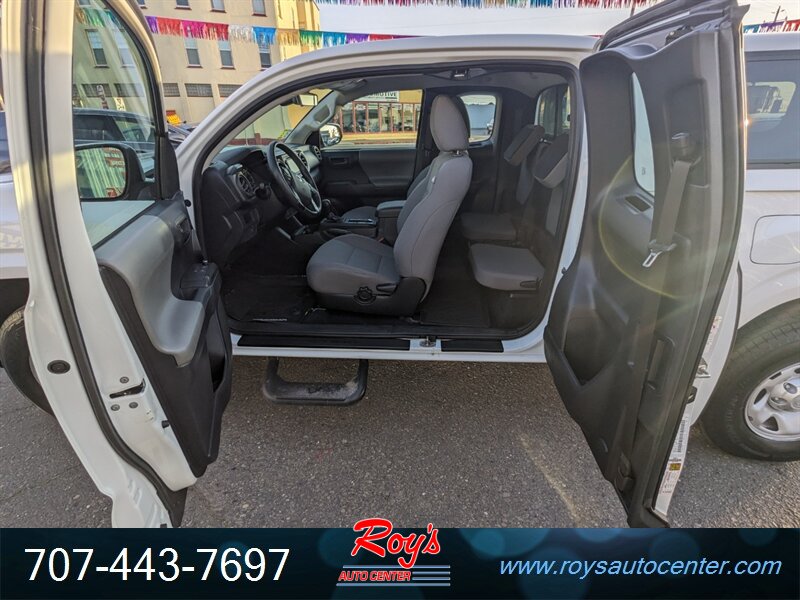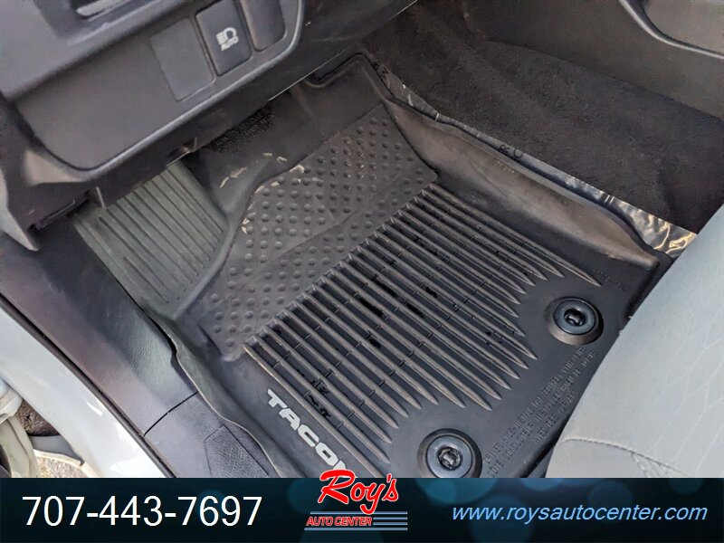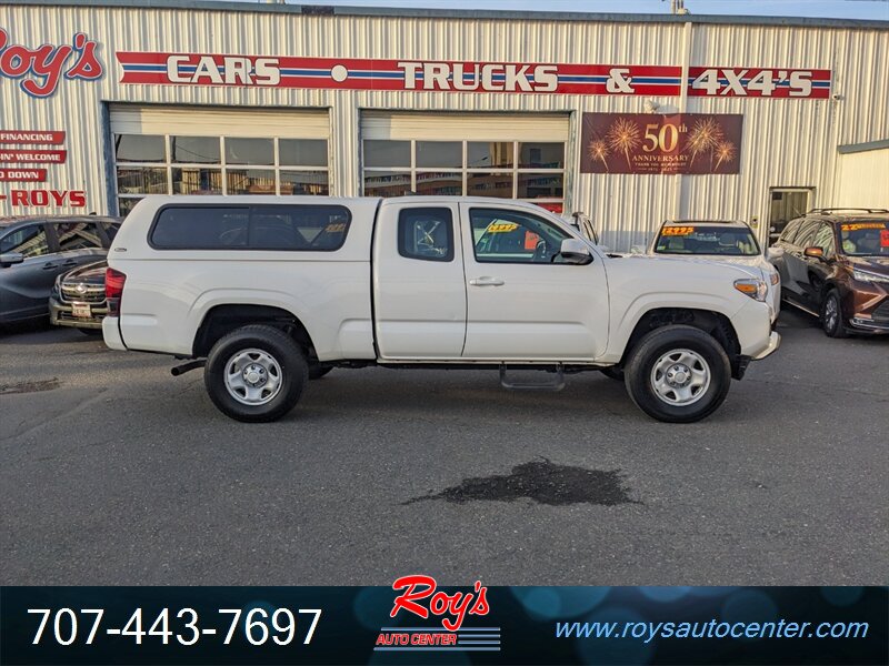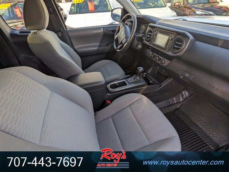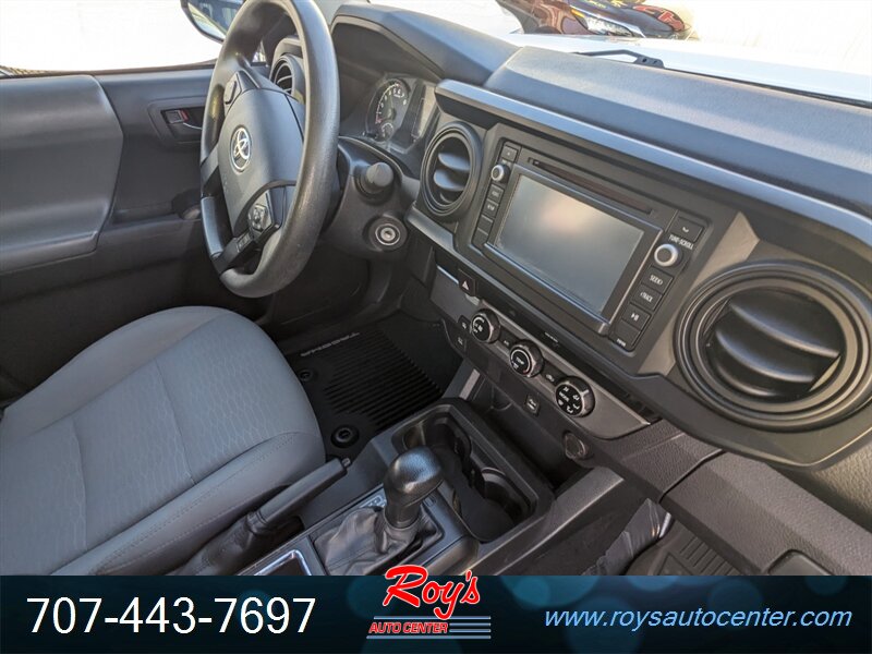 2018 Toyota Tacoma SR in Super White with Cement Gray cloth interior, powered by a 2.7L I4 engine (159 hp, 180 lb-ft). Factory-standard equipment includes cloth seating with a 60/40 fold-up rear bench, manual air conditioning, power windows and door locks, remote keyless entry, cruise control, tilt steering wheel and center console storage. Infotainment and convenience features include an AM/FM audio system with USB/AUX inputs, Bluetooth hands-free phone/audio, steering-wheel audio controls and a rearview backup camera. Safety systems include ABS, traction and stability control and a comprehensive multi-airbag package. Vehicle is in excellent overall condition, has a clean CARFAX and under 49,000 miles (averaging less than 6,000 miles per year).