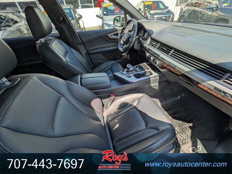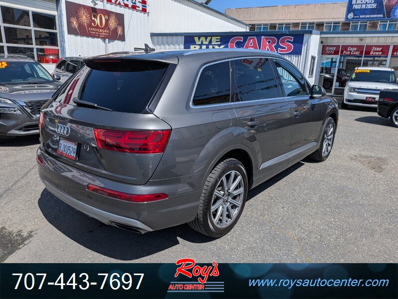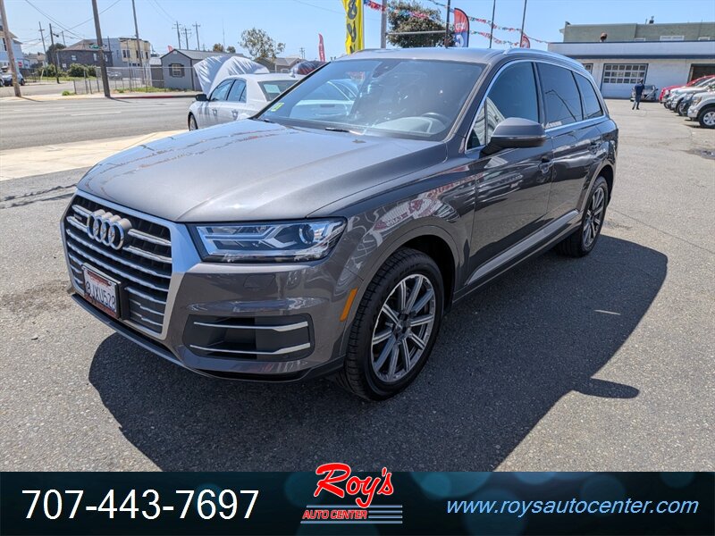 2019 Audi Q7 quattro Premium 45 TFSI AWD in Samurai Gray Metallic with Black leather interior. Powered by a 2.0L turbocharged I4 making 248 hp and 273 lb-ft, paired with an 8-speed automatic and Audi quattro all-wheel drive. Factory-standard features include leather seating surfaces, power-adjustable front seats with driver memory, three-zone automatic climate control, LED headlights and taillights, panoramic sunroof, power liftgate, MMI infotainment with central display, Bluetooth, Apple CarPlay/Android Auto and USB connectivity, rearview camera, parking sensors and Audi pre sense basic. Clean CARFAX, excellent overall condition, under 71,000 miles (avg. <9,000 miles/year).