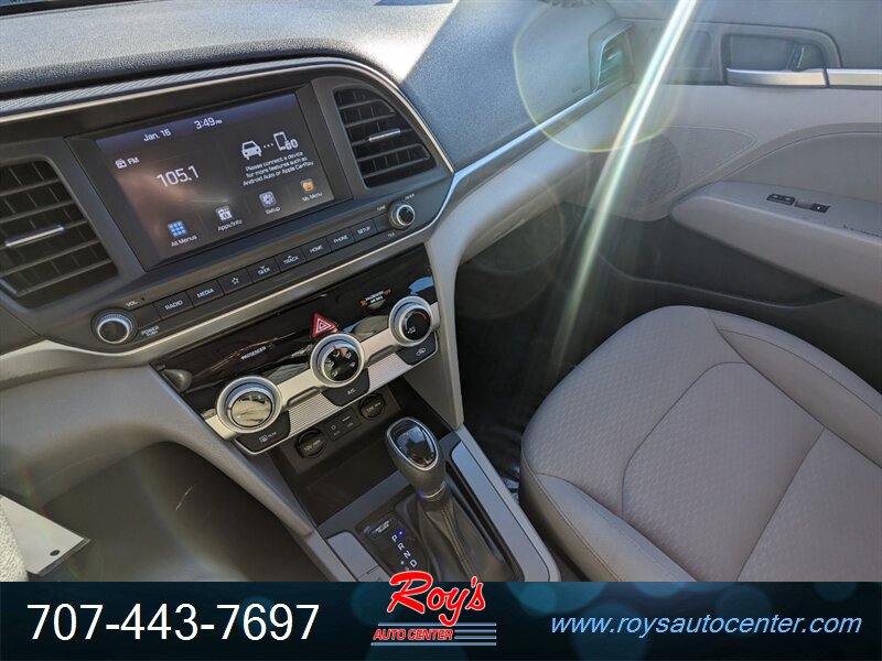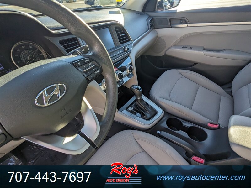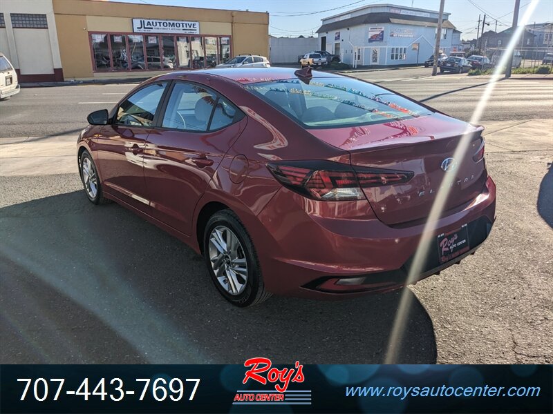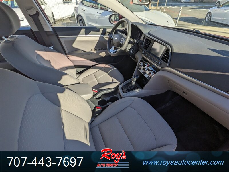 2019 Hyundai Elantra SE in Scarlet Red with Gray cloth interior, powered by the Nu 2.0L I4 engine producing 147 hp and 132 lb-ft of torque. Factory-equipped with standard safety and convenience features including ABS, electronic stability and traction control, multiple airbags, rearview camera, power windows and door locks, remote keyless entry, cruise control, Bluetooth hands-free connectivity, USB input, air conditioning, cloth seating with 60/40 split-folding rear seat, and a tilt-and-telescoping steering column. Fuel economy is 29 MPG city and 38 MPG highway. Vehicle is in excellent overall condition and has a clean CARFAX.
