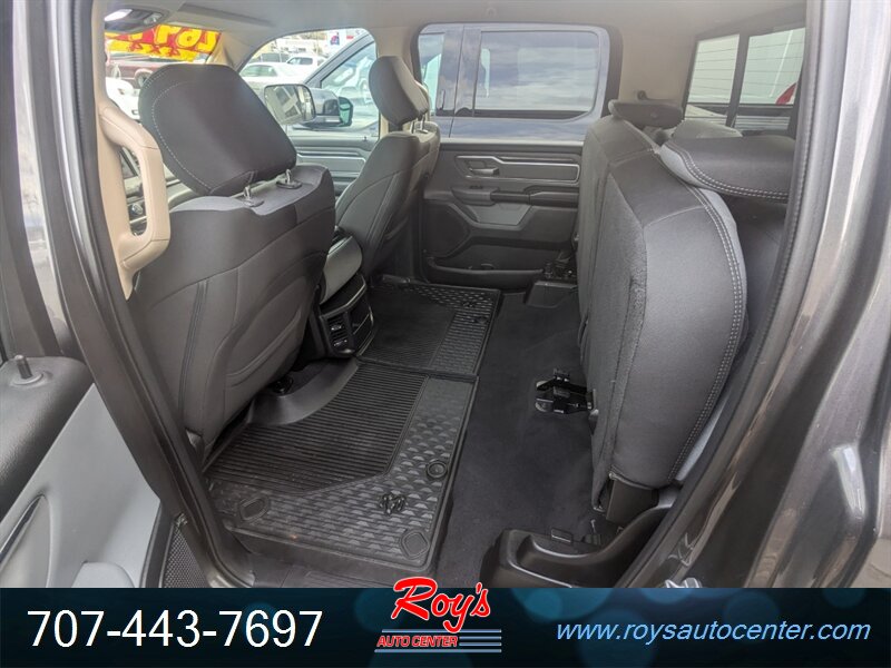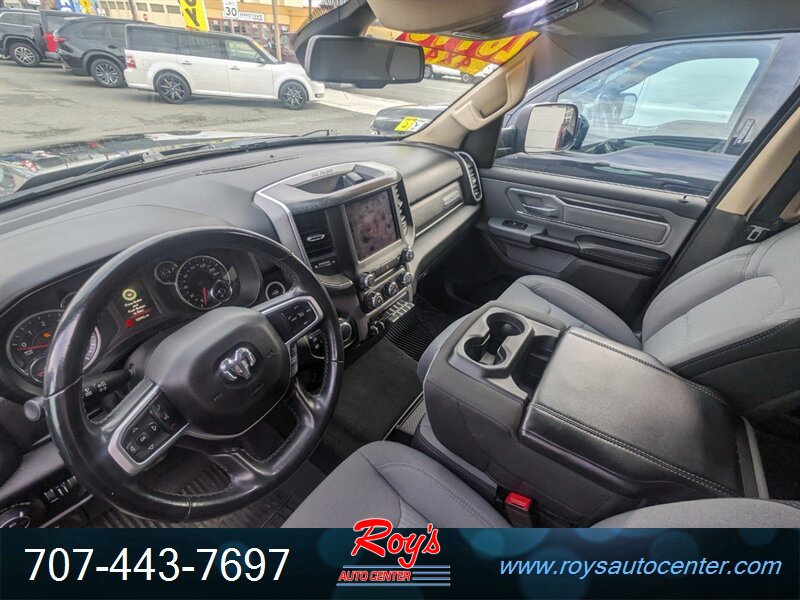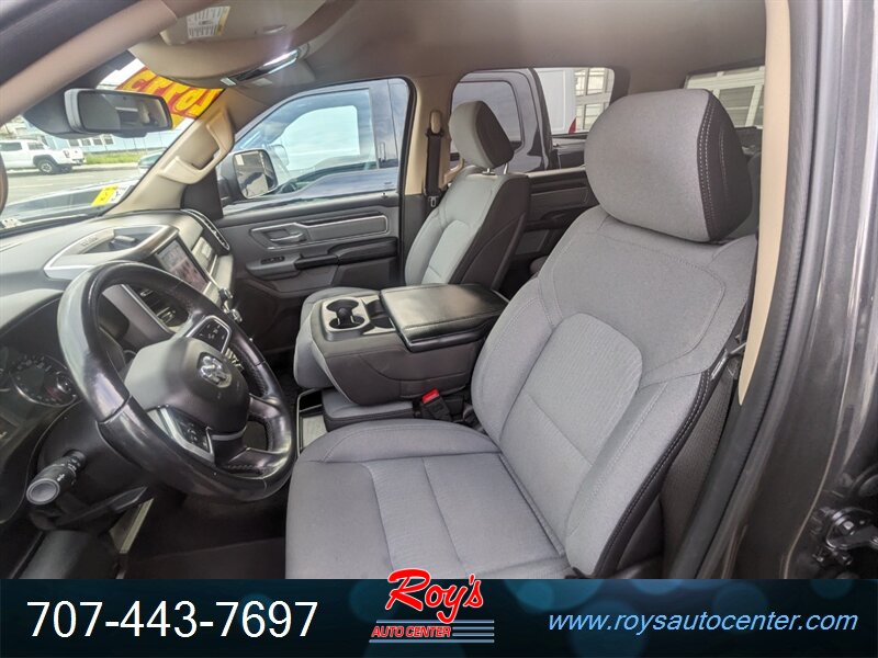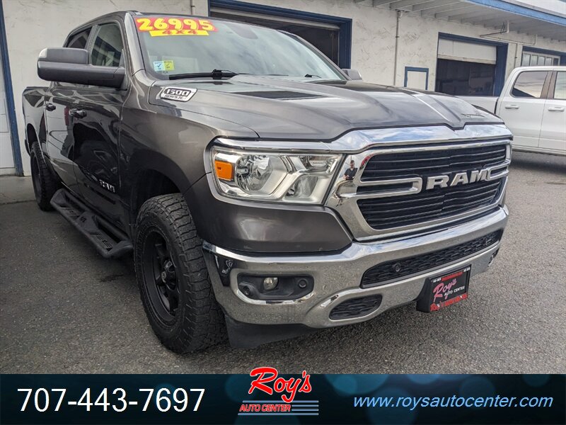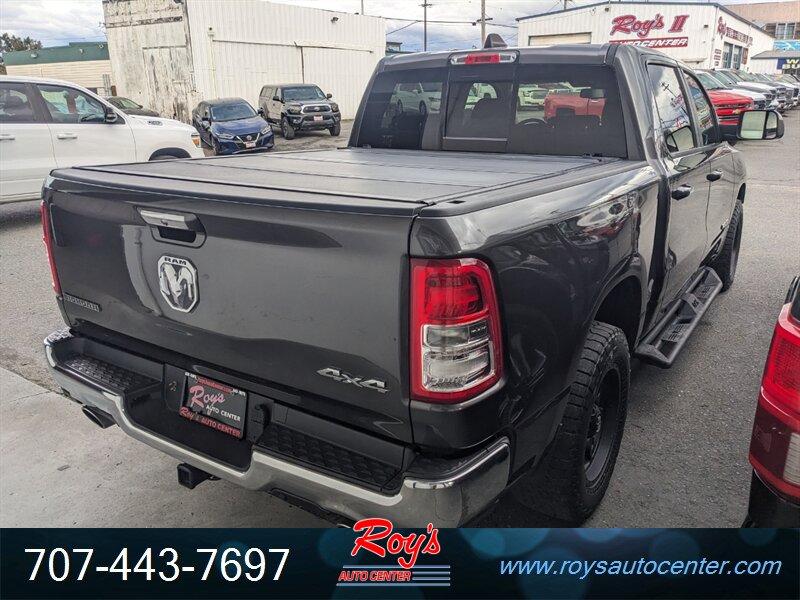2019 RAM 1500 Big Horn 4WD in Granite Crystal Metallic Clear Coat with Diesel Gray/Black cloth interior. Powered by the 5.7L HEMI V8 (395 hp, 410 lb-ft) paired with an eight-speed automatic. Factory-equipped features include 4WD, chrome exterior accents, power windows/locks/mirrors, remote keyless entry, tilt/telescoping steering wheel with audio and cruise controls, cloth 40/20/40 front seating with central storage, 6-speaker audio with Uconnect touchscreen (Apple CarPlay/Android Auto, Bluetooth and USB connectivity), rearview camera, trailer-tow preparation with trailer sway control, ABS, stability and traction control, and front/side-curtain airbags. Vehicle is in excellent overall condition.