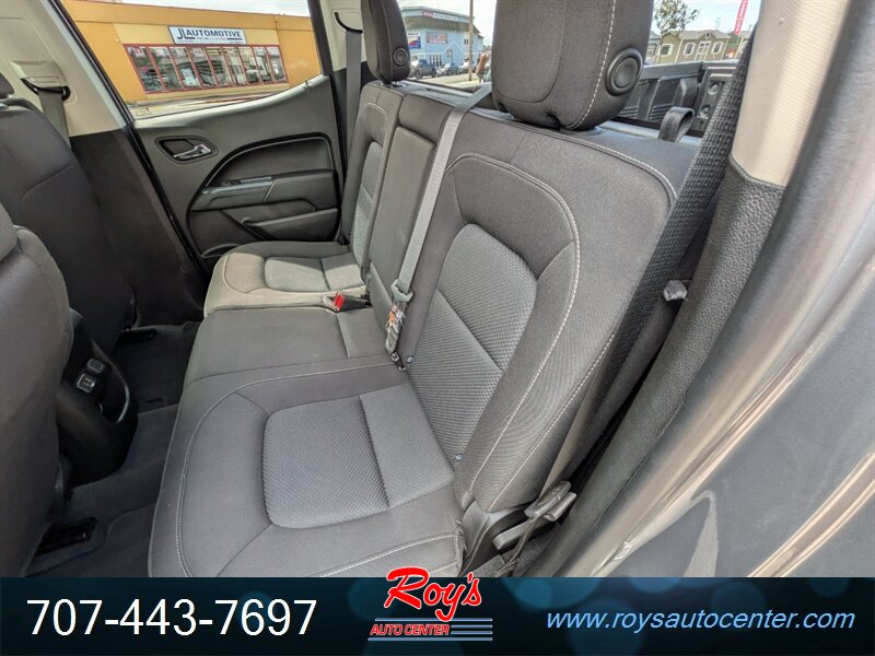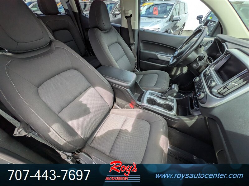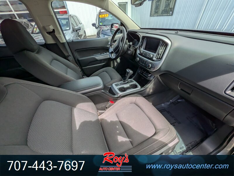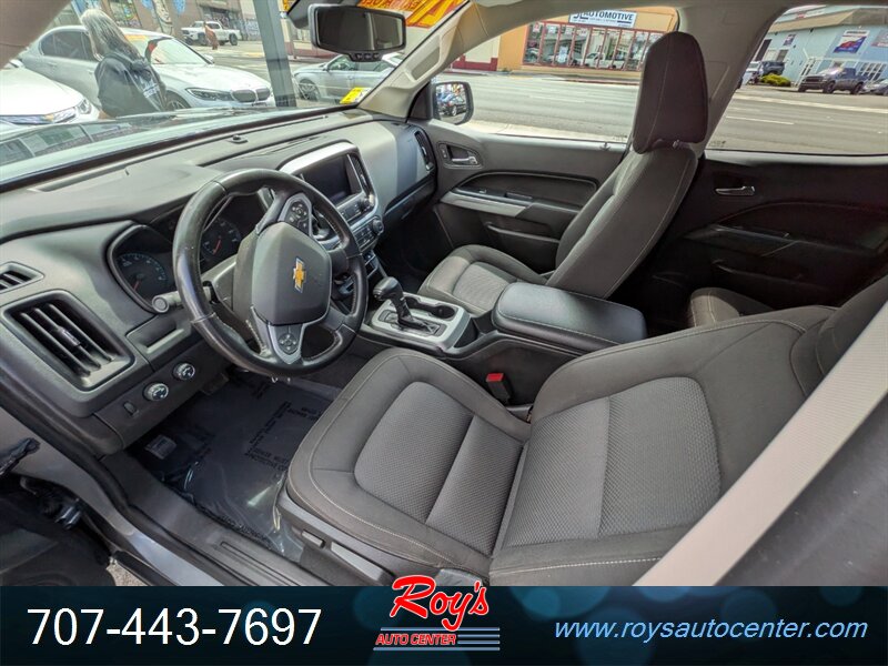 2021 Chevrolet Colorado LT with the 3.6L V6 (308 hp, 275 ft-lbs) and 8-speed automatic — Satin Steel Metallic exterior with a Black interior. Factory equipment includes Chevy Infotainment with a 7-inch touchscreen, Apple CarPlay/Android Auto, Bluetooth and USB connectivity, rear vision camera, OnStar/connected services, remote keyless entry, cruise control, power windows and door locks, cloth seating with a split-folding rear seat, air conditioning and a tilt/telescoping steering column with steering-wheel audio controls. Standard safety and chassis items include four-wheel antilock disc brakes, StabiliTrak electronic stability control, traction control, multiple airbags and a tire pressure monitoring system; the truck bed comes with factory tie-downs and a durable floor. Fuel economy is 17 MPG city / 24 MPG highway, and the vehicle is in excellent overall condition.