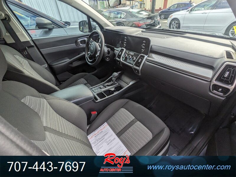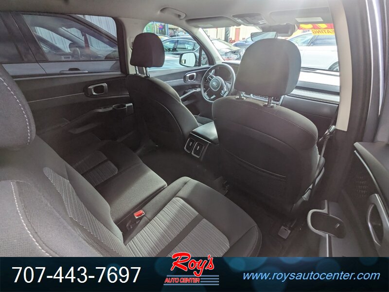2021 Kia Sorento LX in Everlasting Silver with Gray cloth interior, excellent overall condition. Powered by a 2.5L I4 producing 191 hp and 181 lb-ft, with an automatic transmission and EPA ratings of 24 MPG city / 29 MPG highway. Factory-standard equipment includes cloth seating with 60/40 split-folding rear seats, power windows and locks, remote keyless entry, steering-wheel audio and phone controls, touchscreen audio with Apple CarPlay and Android Auto, Bluetooth hands-free, rearview camera, air conditioning, cruise control, ABS with stability control and multiple airbags, plus standard driver-assist features such as forward collision warning with automatic emergency braking and lane-keeping assist.
