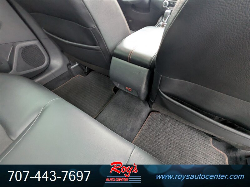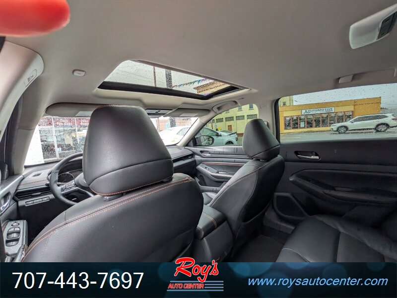 Factory-equipped features include the Nissan Safety Shield 360 suite (automatic emergency braking with pedestrian detection, blind-spot warning, rear cross-traffic alert, lane departure warning, and high-beam assist), an 8-inch touchscreen infotainment system with Apple CarPlay/Android Auto and Bluetooth, dual-zone automatic climate control, push-button start with keyless entry, heated front leather seats, 19-inch alloy wheels with sport-tuned suspension, steering-wheel-mounted controls and paddle shifters, rearview camera, cruise control, and multiple USB ports.