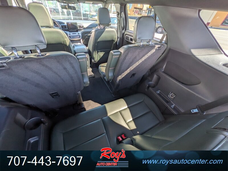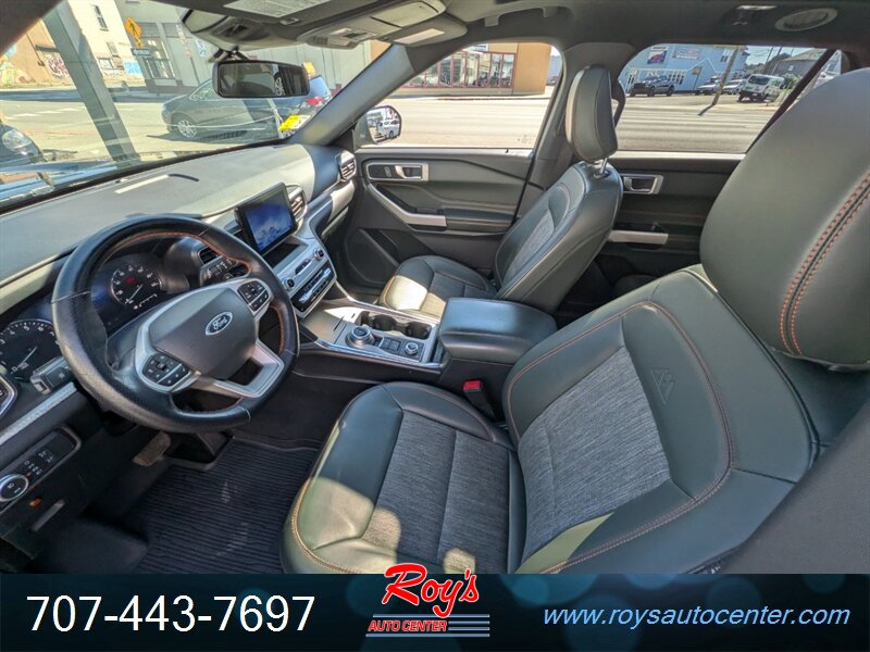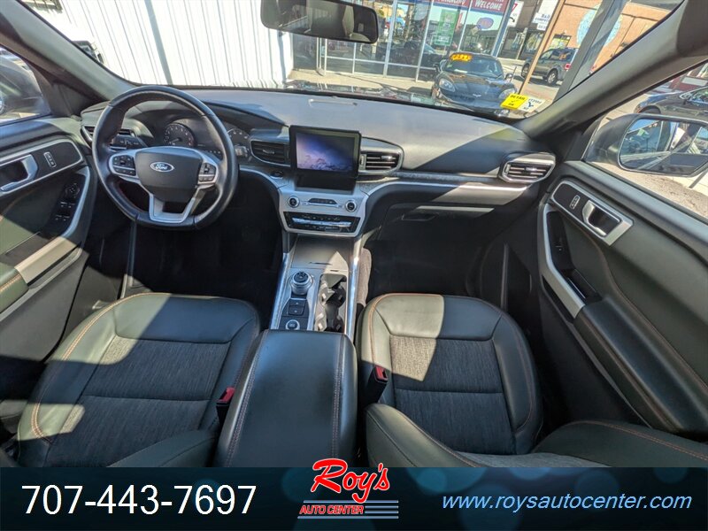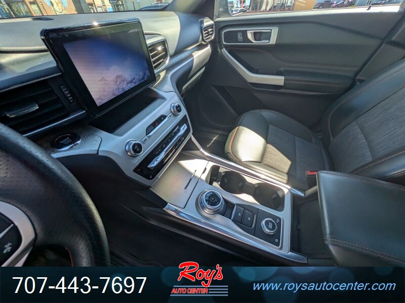 2022 Ford Explorer Timberline AWD powered by an EcoBoost 2.3L Turbo I4 producing 300 hp and 310 lb-ft, paired with a 10-speed automatic transmission. Factory-equipped for light off-road use with all-wheel drive, Timberline suspension tuning, all-terrain tires and a Terrain Management System with selectable drive modes. Standard safety and driver-assist features from Ford Co-Pilot360 include Pre-Collision Assist with Automatic Emergency Braking, Blind Spot Information with Cross-Traffic Alert, Lane-Keeping System, automatic high beams and a rearview camera. Comfort and convenience features include Deep Cypress leatherette seating, power-adjustable front seats with heating, tri-zone automatic climate control, SYNC infotainment with Apple CarPlay/Android Auto, Bluetooth and alloy wheels. Exterior Agate Black; excellent overall condition with under 47,000 miles (averaging less than 10,000 miles per year).