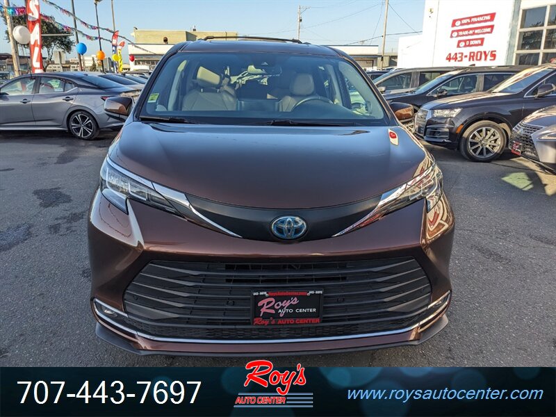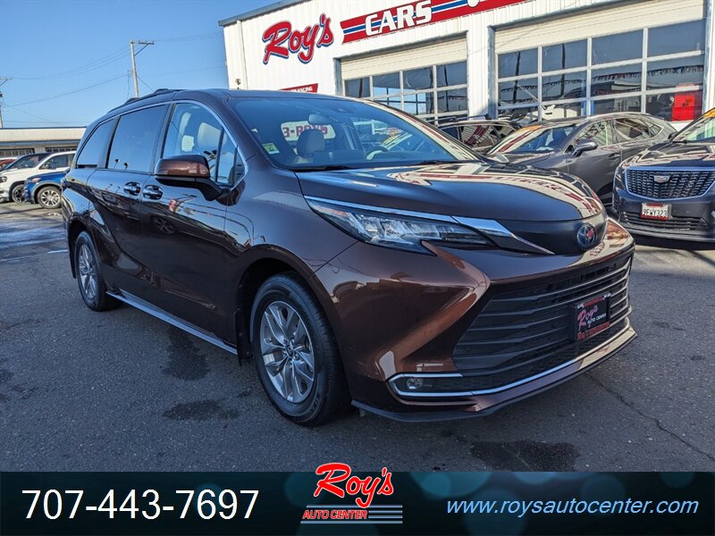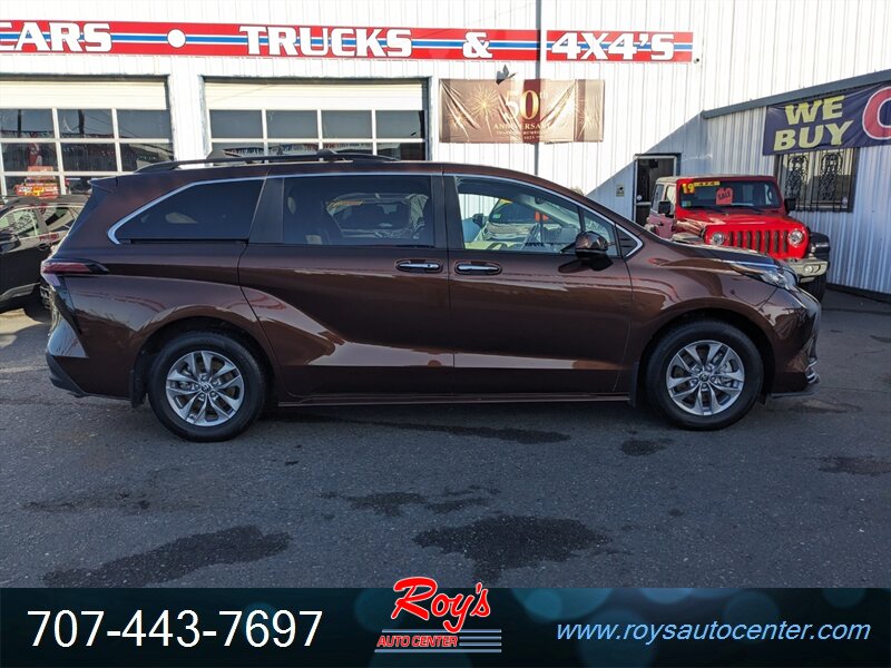 2022 Toyota Sienna XLE AWD in Sunset Bronze Mica with Chateau leatherette interior. Powered by the factory 2.5L Hybrid I4 (245 hp net) with full-time AWD. Factory equipment includes 3rd row seating, Toyota Safety Sense 2.0 (pre-collision with pedestrian detection, lane departure alert with steering assist, lane tracing assist, dynamic radar cruise control), blind-spot monitor with rear cross-traffic alert, LED headlights and taillights, power sliding side doors and power rear liftgate, tri-zone automatic climate control, 8-inch touchscreen infotainment with Apple CarPlay, Android Auto and Amazon Alexa, Bluetooth and multiple USB ports, keyless entry with push-button start, power-adjustable driver’s seat, alloy wheels and rearview camera. Vehicle is in excellent overall condition with a clean CARFAX and one previous owner.